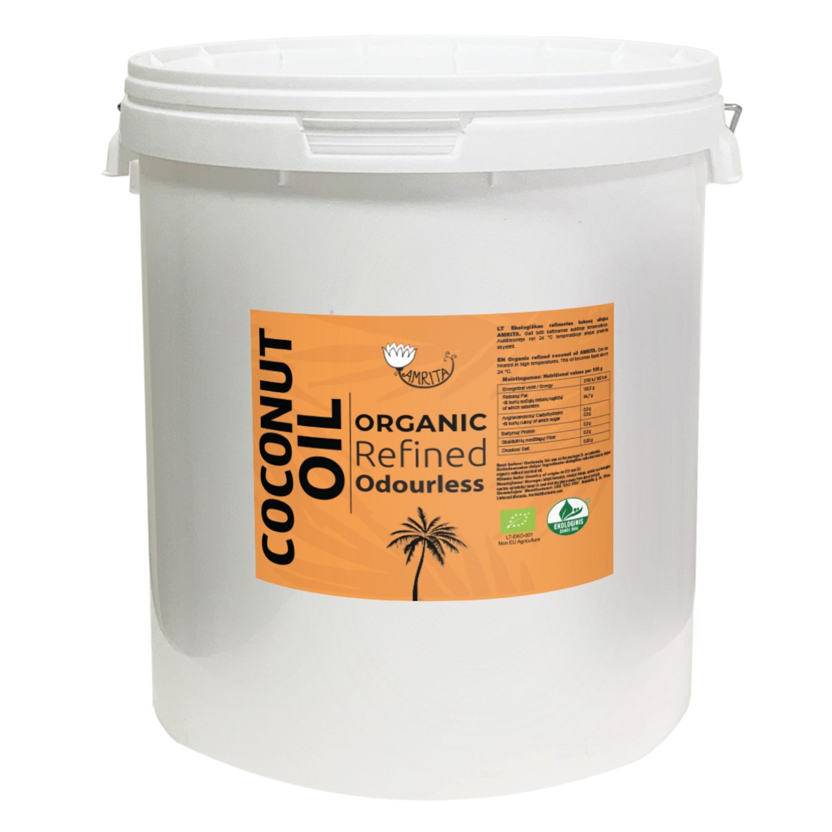 Organic refined coconut oil AMRITA. Can be heated in high temperatures. This oil becomes liquid above 24 °C.